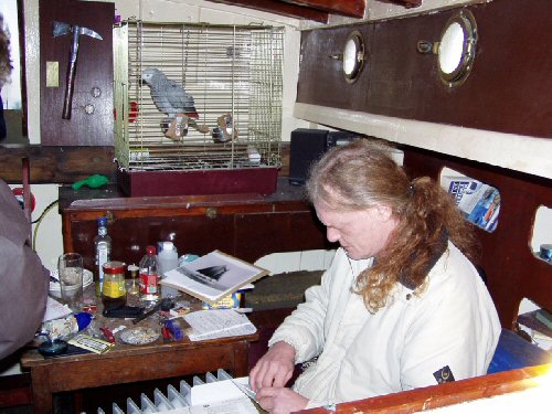 Inside Runagate's cabinAfter the death of the gentleman, the boat had changed hands several times, until Barry had bought it about 2 years ago. Then Barry said that the boat had a bit of a history, because it had been built in 1939 for the writer Nevil Shute. Barry himself had read only one book by Nevil Shute, but in his opinion a boat with this kind of history must be preserved for the future. So he wants to restore her to her former glory and make her sail again. He had started work already, and one of the first things that he had done was rebuilt her engine-bed. Further he had rebuilt the gearbox as this was damaged by too much movement of the propellor-shaft, a problem that was also fixed. He had done all the work from the inside, as taking her out of the water is too expensive. Barry told us, that he was born in 1955 and that he had been with the fire-brigade in London until about 10 years ago, Then he was retired on medical grounds. He told us that he had been living on boats since then, as he has given up women after a couple of unhappy love-affairs.