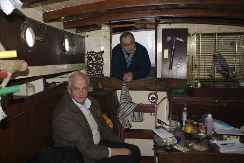 Mike and John in Runagate's cabinSo he hasn't got a lot of money, but we were more and more convinced that his feelings and plans for Runagate are sincere. Barry told us that he had had other people on board already, who were also interested in Runagate. He presented us with a folder with all kind of information, that he had collected about Runagate. In it were several printouts of the web-site of our foundation. He showed us a letter and photo's which he had received from a previous owner, who had sailed Runagate to Portugal. On the photo's she could be seen in Portugal. He told us that he was trying to get as much information about Runagate as possible, but that there were several gaps. We didn't tell him, that we would be able to fill several of those gaps. Further he told us that he paid £14.000 for Runagate. (about $29,500 US, or $36,300 Aus). He was told afterwards that this was maybe a bit too much, but he feels that a boat with this kind of history is worth that kind of money. After about an hour of talking to Barry, looking at his pictures and taking lots of photographs, we left him and invited him to join us in the pub. He said that he would follow shortly. Mike, John and I went to the pub, talking about what we had found out. All three of us were convinced that Barry has his heart in the right place, but we think, that if we would come back in 2 years time, we might find Runagate in much the same state as she is in today. We decided that it would be a good thing to stay in contact with Barry, to follow developments on Runagate. This way we hope that we will see if things are going the wrong way.