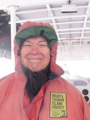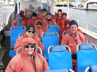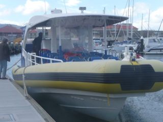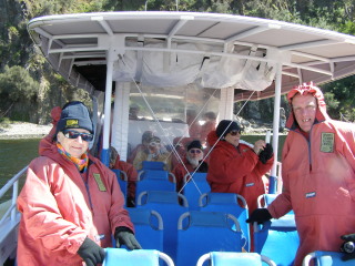 Owner Rob Pennicott gave us a pre-cruise briefing, during which he promised to rearrange a few hairdos! He did! We went down to the boat, a purpose-built high-speed ‘4WD of the sea’, designed to carry over 40 passengers, in any weather, and spent the next few minutes suiting up in the long, hooded, poncho-like, supposedly waterproof garments, plus warm wool beanies and gloves, in preparation for the cruise. Most of us were so rugged up we were barely recognisable.