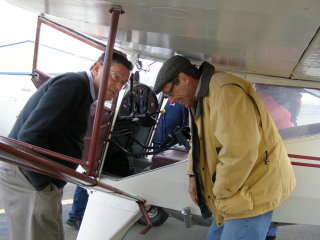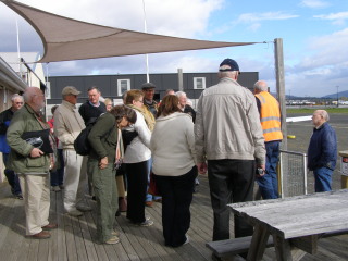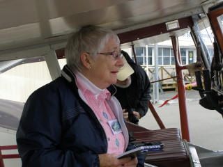 Fifteen minutes later we arrived at Hobart Aero Club and met Rob Gard, owner of “Rosie”, the Auster. Rob had hoped to do a flyover for us but, grounded by a health issue, he proceeded to show us his plane on the tarmac, answering many penetrating questions.