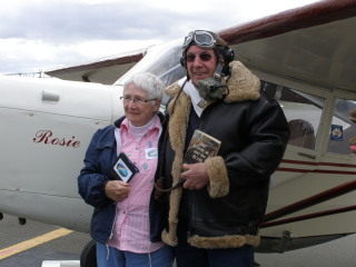 We moved into the club rooms, where his spirited talk included reading a passage out of “The Rainbow and the Rose”. When he asked Heather to sign his copy she agreed, IF he promised to finish reading it! He then donned appropriate flying gear, posing for photographs, much to the delight of all assembled!