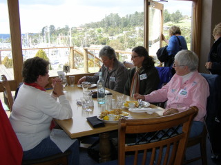 The big week arrived. Saturday, 12th October we drove into Hobart, unloaded everything and checked in at The Old Woolstore. Heather had arrived earlier, so we delighted in renewing our 12-year friendship, while waiting for the rooms to be ready. A short while later Alison arrived, soon followed by Babette, one new friend and one renewed. Then John sauntered in, to a big hug, in gratitude. What a pleasure to formally meet our dedicated mentor at last. We already felt we knew him after all those months of electronic communication! When Laura arrived there were more big hugs, as we renewed our 12-year friendship with her, finally able to thank her face to face for the past eighteen months’ invaluable support and guidance. By evening the group had grown. It was an animated, talkative group that gathered for dinner in the in-house Stockman’s Restaurant.