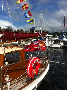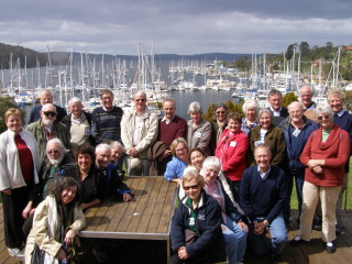 Proceeding down through Kingston, Margate and Snug to the beautiful waterside village of Kettering, we arrived at the yacht basin and small marina in time for morning tea at the Mermaid Cafe and a chance to go aboard Ben Marris’ beautifully restored yacht “Saona”. She was Nevil Shute’s transport to Deny King’s remote settlement on the southwest wilderness coast in 1953, on more than one occasion. Ben had ‘dressed ship’ appropriately, with the bunting spelling out ‘Nevil Shute, Port Davey’...a special touch.