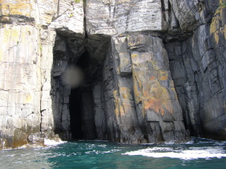 Following the shoreline, we continued down past endless ancient dolerite cliffs, mysterious caves and the occasional blowhole. Rob has perfected the art of nosing the boat in precariously close to the towering rocky shore, anticipating the surging swells, deftly putting her into reverse gear a split second before it seemed she’d be smashed onto the rocks. There were thrills for all and plenty of photographic opportunities, as we dodged unexpected spray from errant blowholes. I commended Heather for her adventurous spirit, to which she replied with a smile, “I inherited it!” How fortunate we are to have her to inspire us.