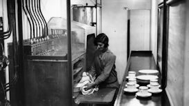 The 50 seat Dining Room of R100. Nevil Shute is climbing the double staircase to the Observation Lounge. Note, in this publicity shot, the badly ironed tablecloth lower right. ( AO ) |