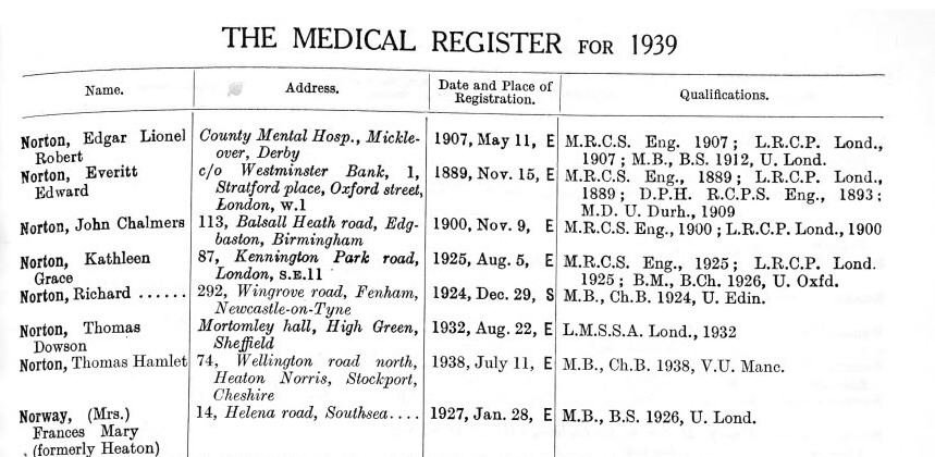 Frances Norway's entry in the Medical Register for 1939 is reproduced here | ![]() |
