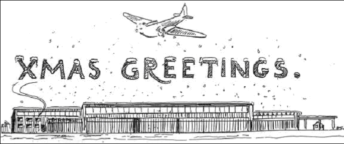 This drawing of an Airspeed Envoy flying over the Airspeed factory at Portsmouth headed up Shute's 1937 Christmas letter to his staff. In the letter Shute says "for myself, I look forward to our future with confidence" but he was jaded and would soon be forced to leave. However, the company would continue to expand and prosper. The drawing is not by Shute. (PL / Copyright BAE SYSTEMS PLC) |